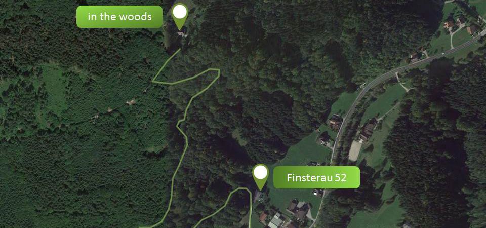 Von der A1 kommend: Abfahrt Regau, dort Richtung Gmunden, dann links weg Richtung Pinsdorf. Im Kreisverkehr weiter Richtung Pinsdorf. In Pinsdorf vor dem Spar rechts ins Aurachtal (grünes Schild). Im Aurachtal bis in den Ort Finsterau fahren (nicht die kleinen Schilder, sondern die großen "echten" Ortsschilder!). Da findest Du auf der rechten Seite eine Bushaltestelle mit Busbucht. Genau am Beginn der Ausbuchtung geht ein Forstweg den Berg hinauf. (Wenn Du am Gasthof Ofner – auch rechts – vorbeigefahren bist, bist Du zu weit!). Die Einfahrt ist klein, das erste Stückerl mit zwei Betonstreifen und dann später Schotter).